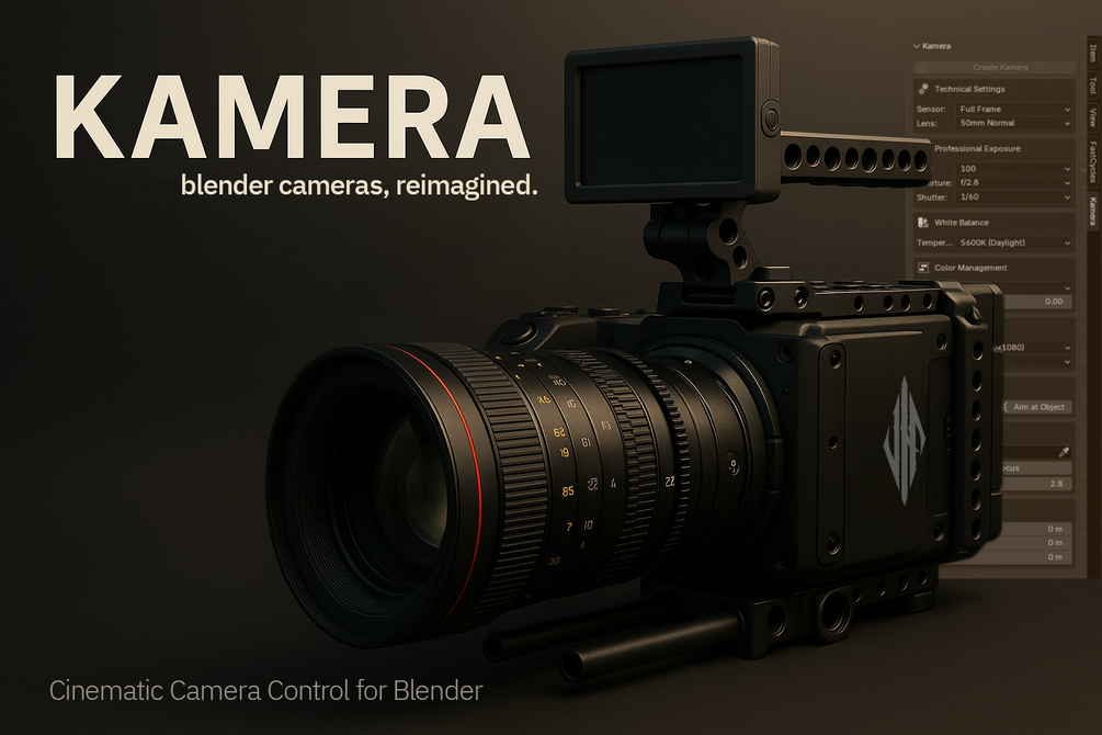 Kamera brings real camera controls to Blender. Simulate ISO, aperture, shutter, sensor, lens, white balance, and cinematic color management for photorealistic renders and precise animation.
